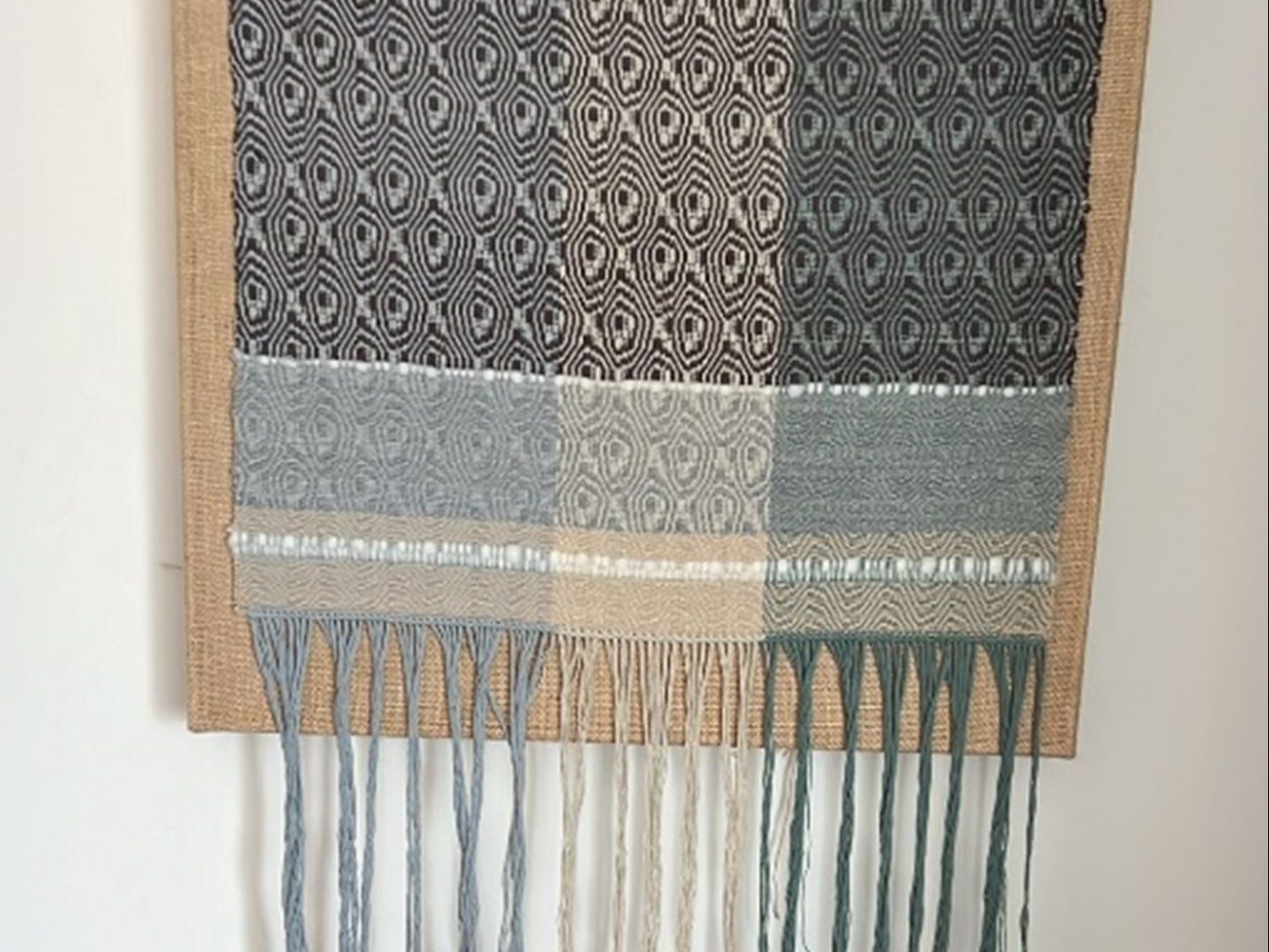 Leslie Mahler’s piece features a woven base for structure, complemented by tapestry-like techniques that provide color and design. The inspiration for this work comes from the beautiful beaches and ocean views that are abundant in Rhode Island.